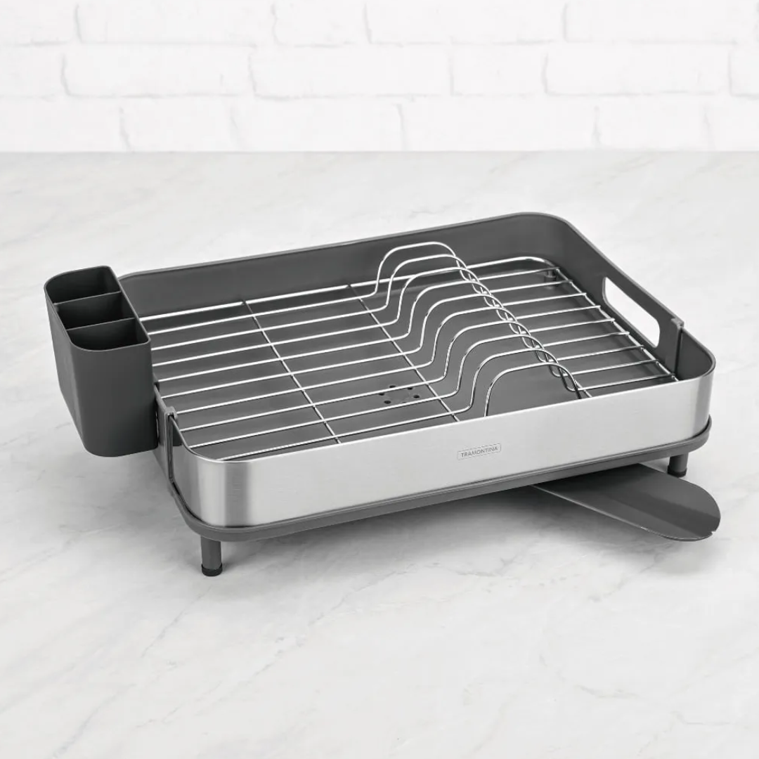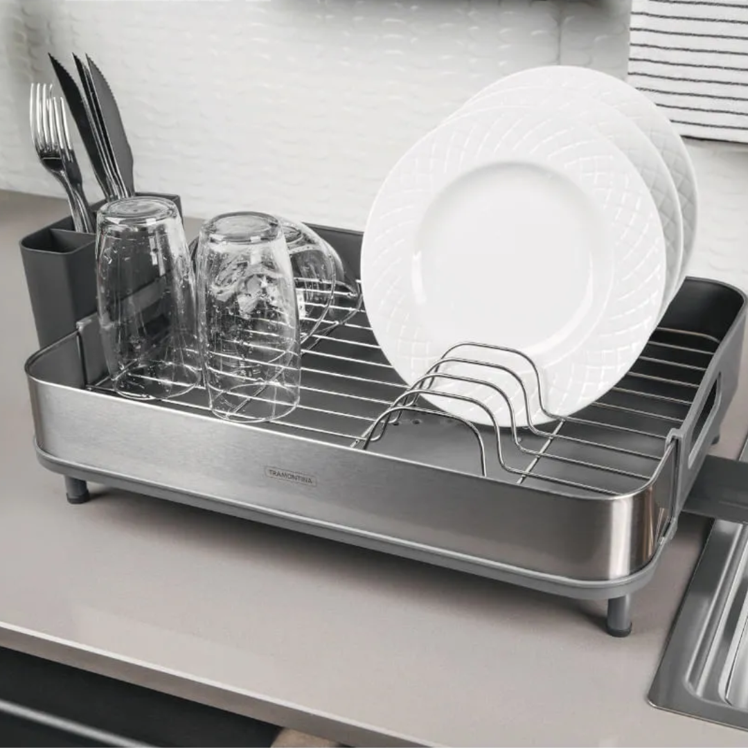 Un escurridor de platos Tramontina diseñado para mantener tu cocina ordenada y eficiente, fabricado en acero inoxidable de alta durabilidad que resiste la humedad y el uso diario. Su estructura pensada cuidadosamente permite acomodar hasta 10 platos, con un diseño práctico que facilita el drenaje gracias al pico móvil 360° que puedes orientar según necesites para canalizar el agua directamente al desagüe sin derrames. El porta cubiertos removible te ofrece mayor comodidad a la hora de lavar y organizar tenedores, cuchillos y cucharas, manteniendo todo en un solo lugar mientras se seca.
