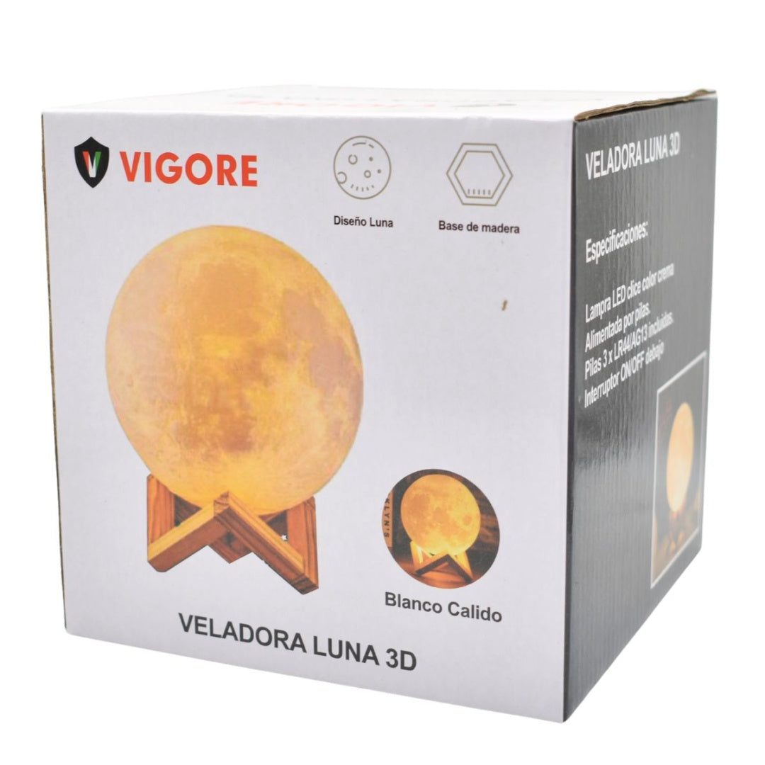 Transforma cualquier espacio con la veladora lámpara luna llena de la marca Vigore. Con un diseño cautivador, esta lámpara aporta una atmósfera mágica a tu hogar. Su estructura de madera y su forma esférica imitan la belleza de la luna, creando un punto focal que despierta la imaginación y la creatividad en tus espacios. Ideal para mesas de noche, salas de estar y rincones especiales, proporciona una luz suave y envolvente.