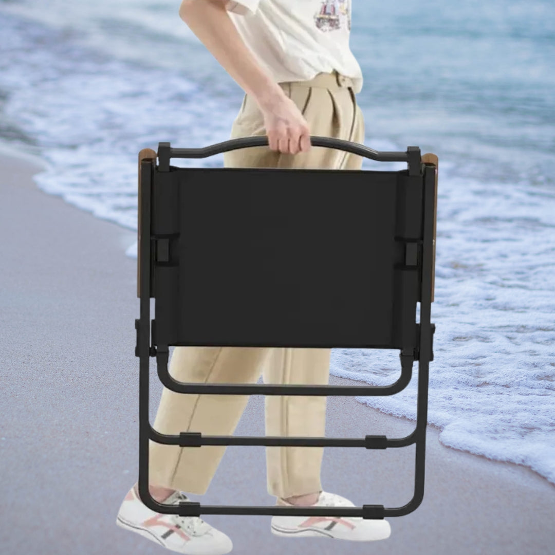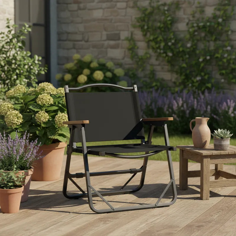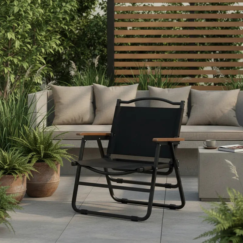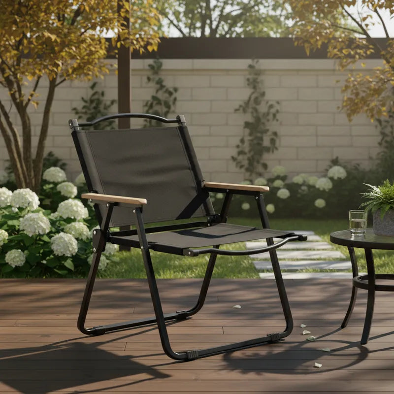 Disfrutá del máximo confort con esta práctica silla plegable de diseño moderno. Fabricada con una estructura de acero resistente y asiento de tela reforzada, ofrece estabilidad y durabilidad en cada uso. Sus apoyabrazos de madera aportan un toque cálido y elegante, ideal tanto para interiores como exteriores.